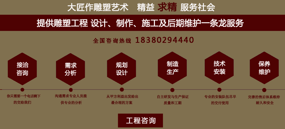 成都大匠作雕塑有限公司,是經(jīng)成都工商局審定注冊(cè)的正規(guī)專業(yè)雕塑制作及工程安裝服務(wù)機(jī)構(gòu),是由一群年輕富有朝氣的年輕人創(chuàng)辦,發(fā)軔于四川省成都市龍泉驛區(qū)。它是一家******于創(chuàng)作、制作和銷售為一體的公司。大匠作擁有多年從事公共藝術(shù)的專業(yè)人員和雕塑制作人組成的核心團(tuán)隊(duì),為您提供專業(yè)、具創(chuàng)新的設(shè)計(jì)及制作服務(wù)。公司成立以來(lái),秉承“******服務(wù)、誠(chéng)信為本”的宗旨,以客戶需求為目標(biāo)導(dǎo)向,不斷學(xué)習(xí),進(jìn)取,優(yōu)化和提高服務(wù)質(zhì)量,公司向您******——“您的滿意***是我們的信譽(yù)”,我們將以飽滿的熱情和******的服務(wù)贏得您的贊譽(yù)和支持。 愛心,細(xì)心,耐心,責(zé)任心是我們的要求,盡心盡職,為您打造出創(chuàng)新、專業(yè)、******的設(shè)計(jì)方案,我們堅(jiān)信先做人、后做事,用心對(duì)待客戶,實(shí)行透明收費(fèi),人性化服務(wù),本著對(duì)客戶負(fù)責(zé),對(duì)客戶負(fù)責(zé),更是對(duì)自己發(fā)展負(fù)責(zé)的態(tài)度,爭(zhēng)取做到讓每位客戶滿意